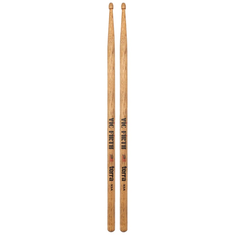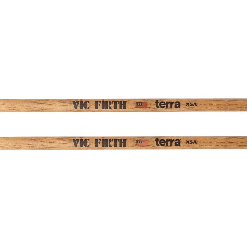 Par baquetas Vic Firth X5AT Terra Series, fabricadas en hickory estadounidense con acabado teñido único que resalta la veta natural. Modelo extendido del 5AT, ofrece mayor longitud (16.5”) para más alcance y potencia. Punta de madera tipo lágrima, diámetro medio de 0.565” y cono equilibrado. Ideal para estilos enérgicos que requieren versatilidad, control y proyección.