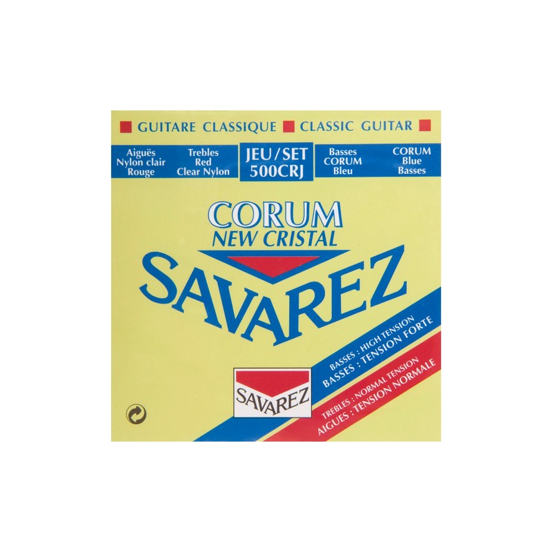 El juego de cuerdas de tensión mixta Savarez 500CRJ para guitarras de cuerdas de nylon. Se compone de Nylon Cristal de tensión normal combinadas con bajos Corum de alta tensión.