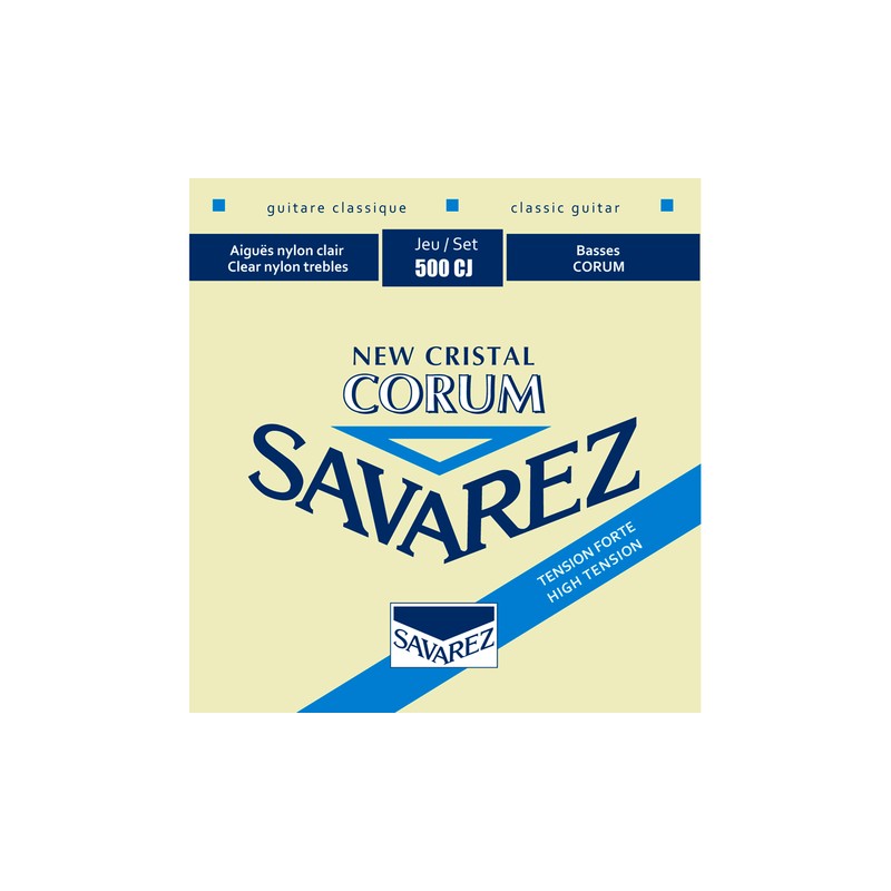 En la encordadura Savarez New Cristal Corum las cuerdas agudas (E1 - B2 - G3) son de nylon mejorado, cuerdas simples. Con un sonido claro de nylon transparente. Las cuerdas graves (D4 - A5 - E6) son Corum, cuerdas flexibles, entorchado denúcleo de nylon. Una innovación de Savareznunca antes hecha. Excelentes matices y colores de sonidos, respuesta rápida como una cuerda más rígida.